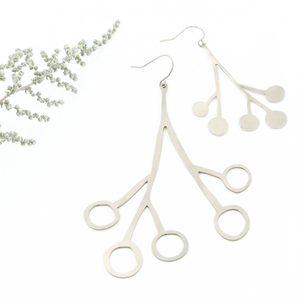 De oorbellen zijn verschillend van lengte en vorm 7 cm en 7.5 cm lang vanaf het haakje. Ze zijn verkrijgbaar in de kleuren zwart, zilver en goud/brons.